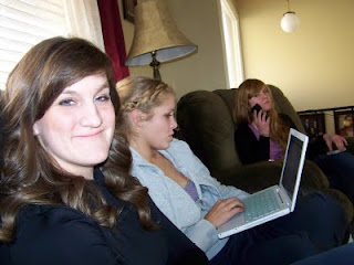 Jordon was eating a piece of chocolate. Audrey and Rachel were checking out blogs and Jeri was fixing her phone. Jordan is wearing her daddy's hat after he came home from drill.